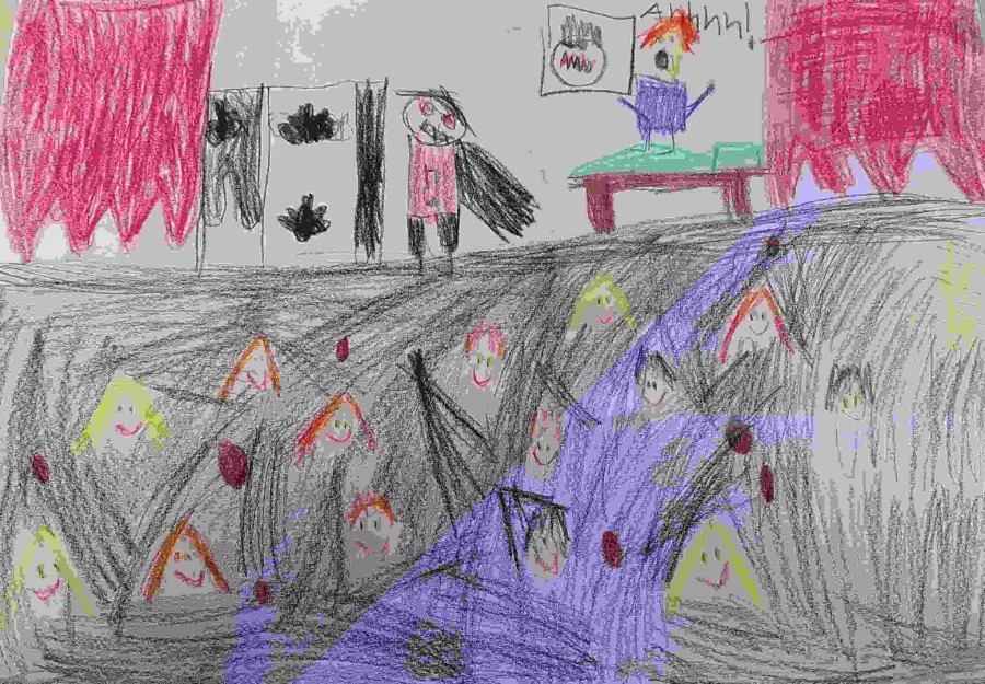 Die Schüler waren so begeistert, dass sie in Gruppen Bilder von diesem Stück malten. Diese gibt es hier in unserer Kustausstellung zu bewundern!